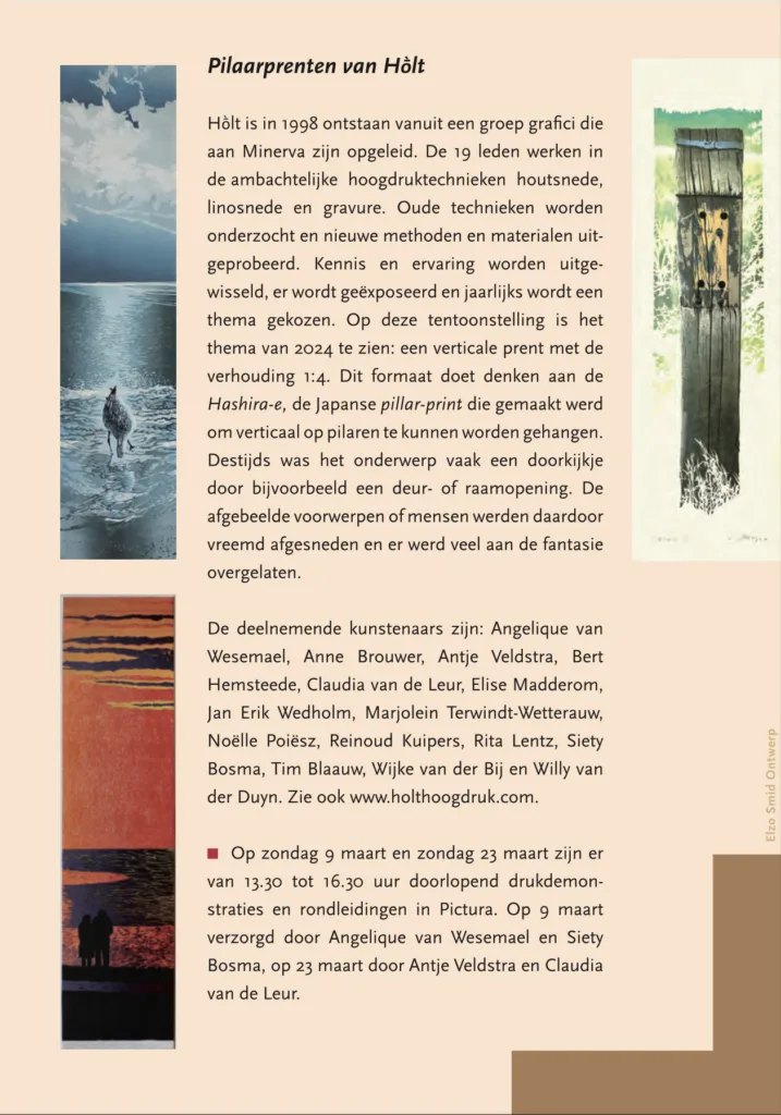 Op deze tentoonstelling is ons thema van vorig jaar te zien: een verticale prent met de verhouding 1:4. Dit formaat doet denken aan de Hashira-e, de Japanse Pillar-print die gemaakt werd om verticaal op pilaren te kunnen worden opgehangen. Destijds was het onderwerp vaak een doorkijkje door bijvoorbeeld een deur- of raamopening. De afgebeelde voorwerpen of mensen werden daardoor vreemd afgesneden en er werd veel aan de fantasie overgelaten.
